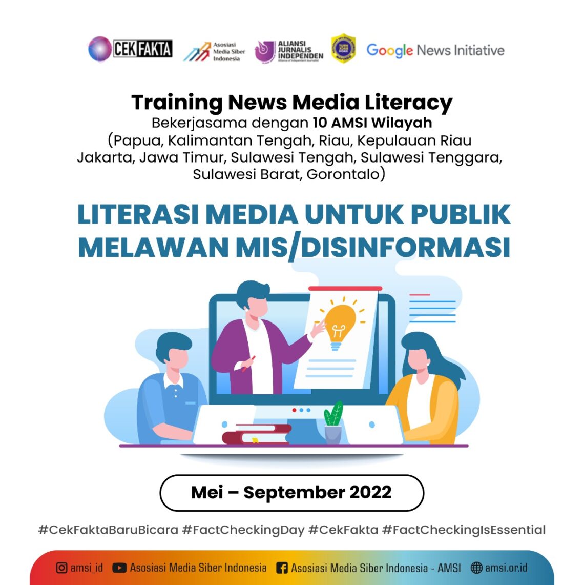 JAKARTA, JurnalBorneo.co.id – Asosiasi Media Siber Indonesia (AMSI) menyelenggarakan pelatihan literasi berita (news literacy training) di 10 wilayah di Indonesia dari bulan Mei hingga September 2022. Melalui pelatihan ini, publik diharapkan memiliki pemahaman tentang pentingnya literasi media.