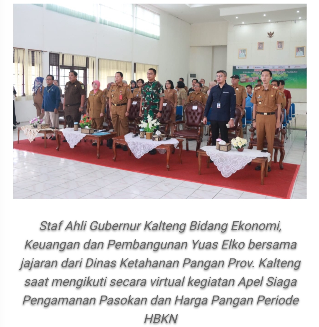 Palangka Raya-jurnalborneo. co.id Staf Ahli Gubernur Kalimantan Tengah Bidang Ekonomi, Keuangan dan Pembangunan Yuas Elko bersama jajaran dari Dinas Ketahanan Pangan Prov. Kalteng mengikuti secara virtual kegiatan Apel Siaga Pengamanan Pasokan dan Harga Pangan Periode Hari Besar Keagaman Nasional (HBKN), di Aula Kantor Dinas Ketahanan Pangan Prov. Kalteng, Senin (1/4/2024).