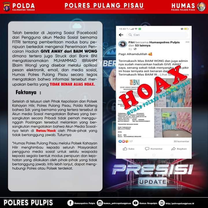 Pulang Pisau, JurnalBorneo.co.id – Modus baru kini beredar di jejaring sosial (Facebook) dari pengguna akun media sosial bernama Fitri tentang dugaan penipuan berkedok penerimaan pencairan hadiah give awey dari Baim Wong. Di situ tertera juga struck dari Bank BNI mengatasnamakan Muhammar Ibrahim (Baim Wong) yang disebar melalui aplikasi pesan elektronik, email, dan media sosial.