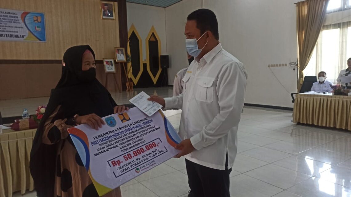 LAMANDAU, JurnalBorneo.co.id – Bupati Lamandau H Hendra Lesmana melalui Dinas Pekerjaan Umum dan Penataan Ruang, Perumahan dan Kawasan Permukiman dan Pertanahan mengadakan menyerahkan Buku Tabungan Bantuan Stimulan Penyediaan Rumah Swadaya Pra Sejahtera Individual (BSPRSPI) kepada 38 Kepala keluarga di Aula Bappedalitbang Kabupaten Lamandau, Rabu (22/6/2022).