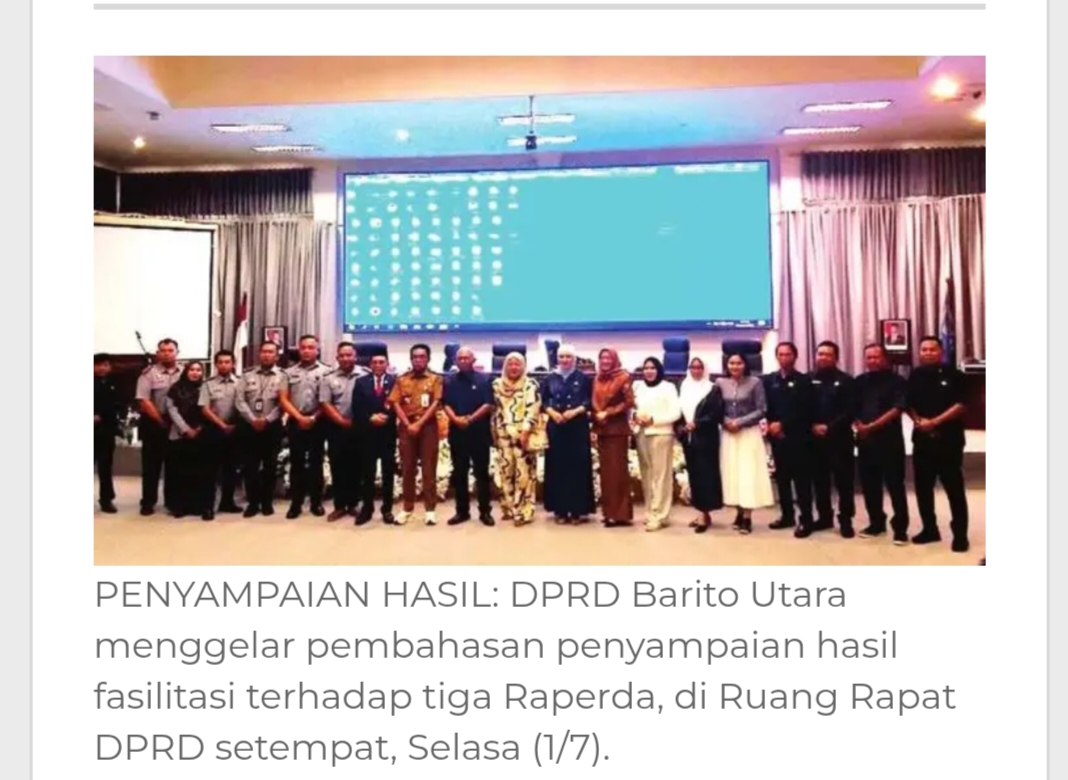 DPRD Kabupaten Barito Utara menggelar rapat pembahasan penyampaian hasil fasilitasi terhadap tiga Rancangan Peraturan Daerah (Raperda), di Ruang Rapat DPRD setempat, Selasa (1/7).