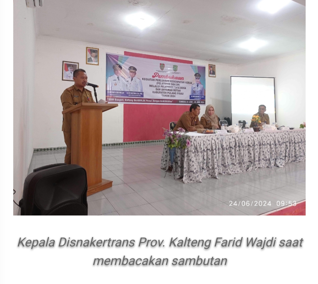 Kepala Disnakertrans Prov. Kalteng Farid Wajdi mewakili Sekretaris Daerah Prov. Kalteng Nuryakin membuka Pelatihan Perluasan Kesempatan Kerja (Pelatihan DBH -DR) melalui pelatihan Tata Boga dan Anyaman Rotan, di desa Kalawa Kecamatan Kahayan Hilir Kabupaten Pulang Pisau, Senin (24/6/2024).