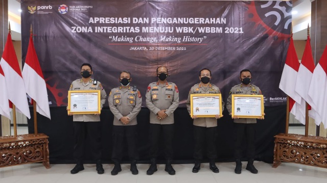 “Penganugrahan ini merupakan bentuk apresiasi dari pimpinan dalam hal ini Kemenpan RB kepada Polri, atas terwujudnya Wilayah Bebas dari Korupsi (WBK) dan Wilayah Birokrasi Bebas Melayani (WBBM) di tiap tiap Satuan Unit Kerja di Wilayah,” ungkap Kapolda.