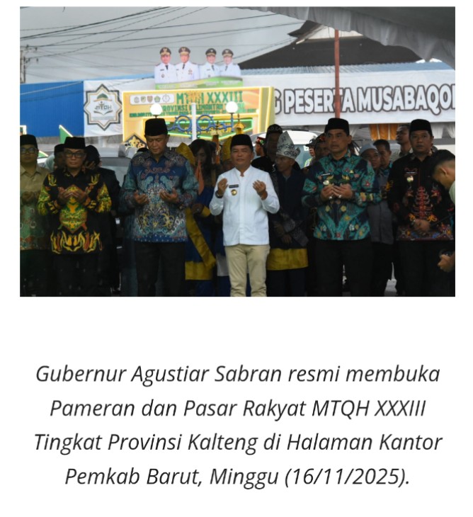 Dalam rangkaian kegiatan Musabaqah Tilawatil Quran dan Hadits (MTQH) XXXIII Tingkat Provinsi Kalimantan Tengah (Kalteng) yang berlangsung di Barito Utara (Barut), Gubernur Agustiar Sabran berkesempatan membuka Pameran dan Pasar Rakyat pada Minggu (16/11/2025).