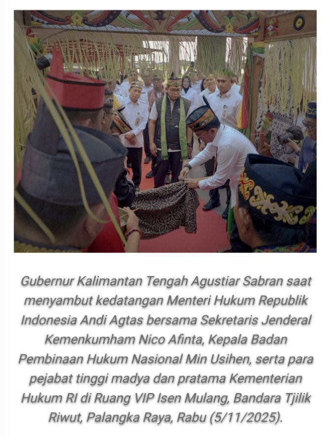Kedatangan rombongan Menkum RI disambut secara hangat dengan prosesi adat Dayak sebagai bentuk penghormatan dan simbol selamat datang kepada tamu kehormatan di Bumi Tambun Bungai.