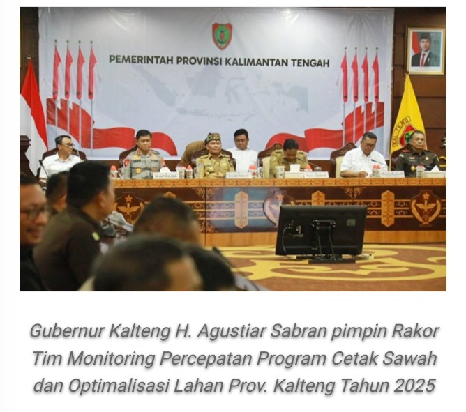 Gubernur Kalimantan Tengah H. Agustiar Sabran memimpin langsung Rapat Koordinasi (Rakor) Tim Monitoring Percepatan Program Cetak Sawah dan Optimalisasi Lahan (OPLAH) Prov. Kalteng Tahun 2025 yang digelar di Aula Eka Hapakat (AEH), Lantai III Kantor Gubernur Kalteng, Selasa (29/07/2025).