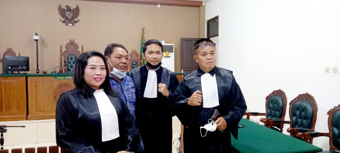 Foto: Supriady, S.Sos Alias Ujup Anak Dari Aman Sentosa (batik biru) foto bersama dengan kuasa hukum seusai sidang putusan bebas di Pengadilan Tipikor Palangka Raya, Selasa (6/9/2022) sore.