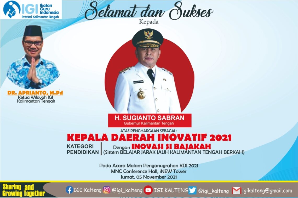 Seperti diberitakan sebelumnya, Gubernur Kalteng H. Sugianto Sabran meraih penghargaan Kepala Daerah Inovatif (KDI) Bidang Pendidikan. Penghargaan diberikan oleh MNC Portal Indonesia (MPI) atas inovasi dan terobosannya dalam membangun daerah di tengah pandemi Covid-19, khususnya di bidang Pendidikan.