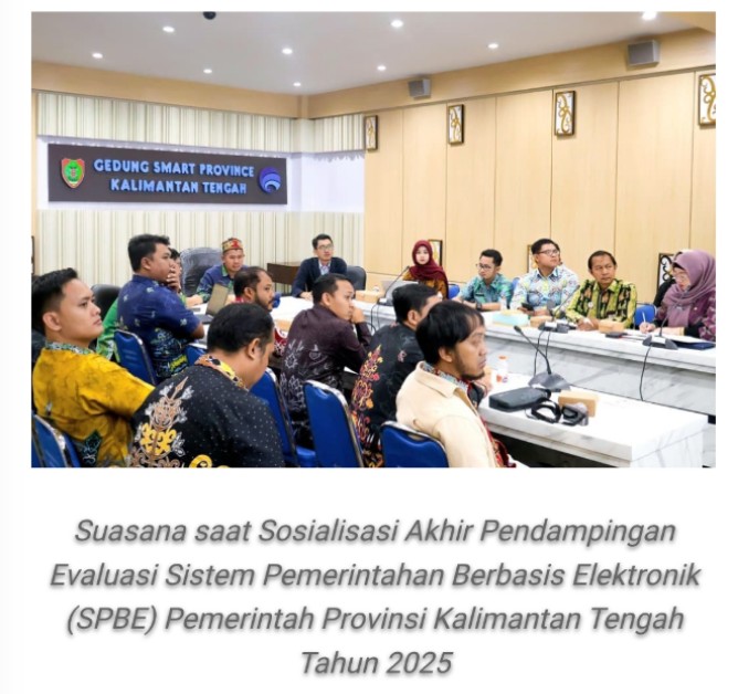 Sosialisasi Akhir Pendampingan Evaluasi Sistem Pemerintahan Berbasis Elektronik (SPBE) Pemerintah Provinsi Kalimantan Tengah Tahun 2025 digelar di Gedung Smart Province (GSP) Dinas Komunikasi, Informatika, Persandian, dan Statistik Provinsi Kalimantan Tengah, Kamis (2/10/2025).