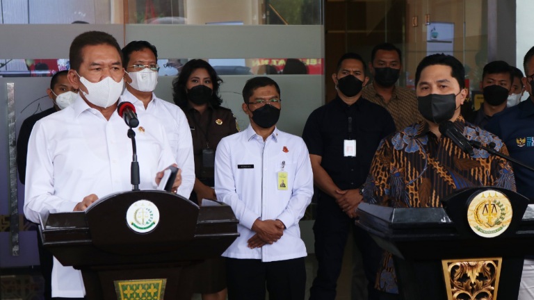 FOTO : Jaksa Agung RI Burhanuddin (kiri) dan Menteri Badan Usaha Milik Negara (BUMN) Erick Thohir sedang memberikan keterangan pers kepada para wartawan di Gedung Menara Kartika Adhyaksa Kebayoran Baru Jakarta Selatan, Selasa (11/1/2022).*puspenkum kejagung.