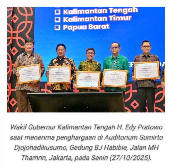 Penghargaan nasional tersebut diserahkan secara resmi kepada Wakil Gubernur Kalteng H. Edy Pratowo, yang mewakili Gubernur Kalteng dalam acara penganugerahan di Auditorium Sumirto Djojohadikusumo, Gedung BJ Habibie, Jalan MH Thamrin, Jakarta, pada Senin (27/10/2025).