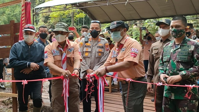 (FOTO : Kapoda Kalteng Irjen Pol. Dr Dedi Prasetyo (dua dari kanan) didampingi Danrem 102 Panju Panjung Brigjen TNI Purwo Sudaryanto (tiga dari kanan) memotong pita tanda diresmikannya objek wisata Air Terjun Bumbun, Sabtu (18/9/2021))*tbn.