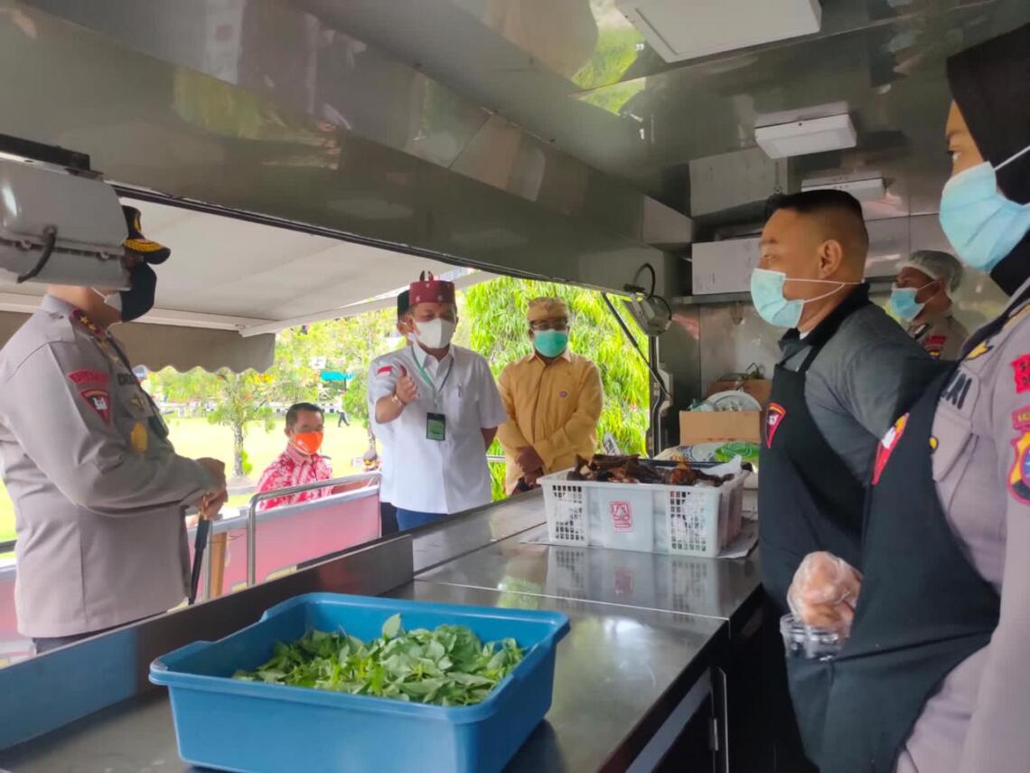 PALANGKA RAYA, JurnalBorneo.co.id – Kapolda Kalteng Irjen Pol Dr. Dedi Prasetyo, M.Hum., M.Si., M.M., didampingi Wakapolda Kalteng cek secara langsung persiapan dapur lapangan Polda Kalteng yang dilaksanakan oleh Satbrimob di Mako Detasemen Gegana Jl. Tjilik Riwut KM.1 Kota Palangka Raya. Senin (02/08/2021) pagi.