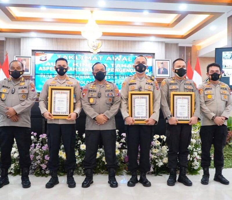 Setelah kegiatan taklimat awal selesai, Kapolres Seruyan AKBP Bayu Wicaksono beserta 5 Kapolres lainnya dipanggil ke depan untuk mendapatkan penghargaan atas prestasi terbaik peringkat 1 dalam hal Penanganan Covid 19 serta Pemulihan Ekonomi Nasional (PCPEN).