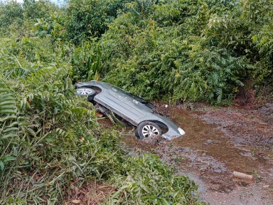 Dari Informasi warga sekitar tempat kejadian, diduga mobil minibus yang ditumpangi satu keluarga tersebut masuk ke parit bernomor polisi KH 1326 BE.
