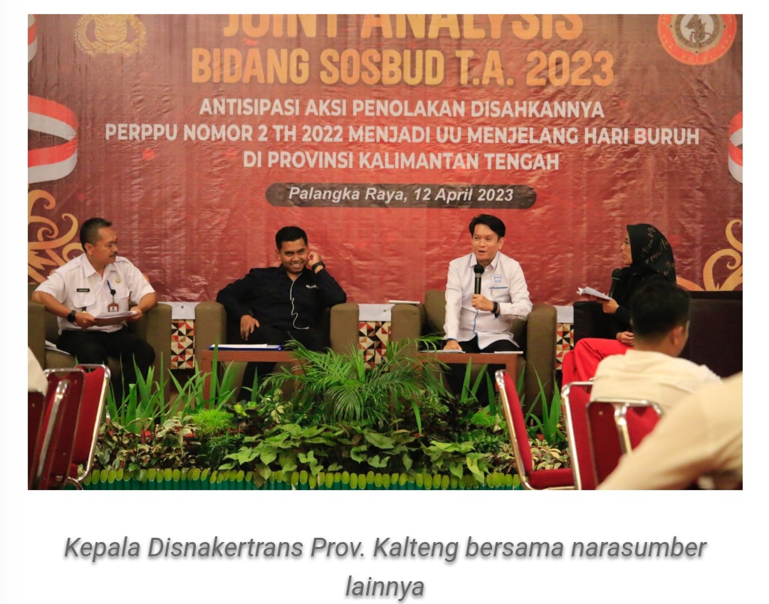 Hal ini disampaikan Kepala Dinas Tenaga Kerja dan Transmigrasi (Disnakertrans) Provinsi Kalimantan Tengah (Prov. Kalteng) Farid Wajdi saat menjadi salah satu narasumber kegiatan Joint Analisis Bidang Sosial Budaya Tahun 2023 dengan tema “Antisipasi berkembangnya Polemik PERPU Cipta Kerja Menjelang Peringatan Hari Buruh Tahun 2023”, yang diselenggarakan Direktorat Intelkam Kepolisian Daerah Kalimantan Tengah di Hotel Aquarius Palangka Raya, Rabu (12/4/2023).