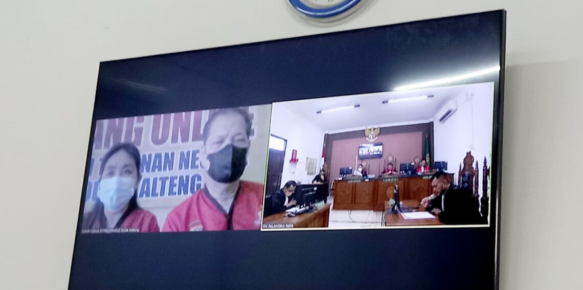 Foto: Suasana persidangan investasi bodong di Pengadilan Negeri Palangka Raya, tampak terdakwa Poltak Josef Novianto Vito Siagian dan Bella Cicilia (layar kiri) mengikuti secara daring dari Rutan Polda Kalteng, Kamis (18/8/2022) pagi. (red)