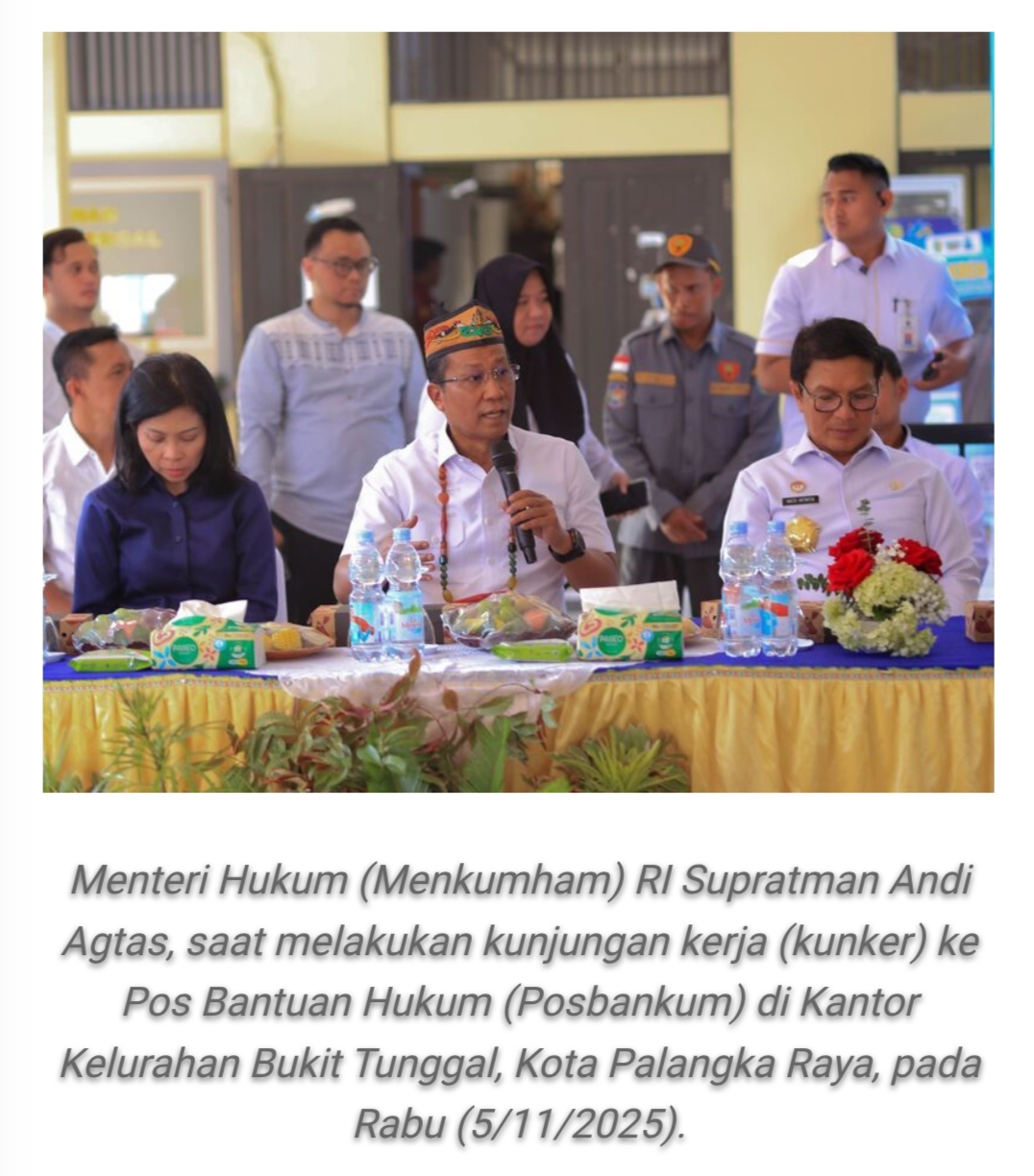 Menteri Hukum (Menkum) RI Supratman Andi Agtas, melakukan kunjungan kerja (kunker) ke Pos Bantuan Hukum (Posbankum) di Kantor Kelurahan Bukit Tunggal, Kota Palangka Raya, pada Rabu (5/11/2025).