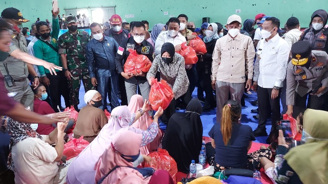 (FOTO : Menteri Sosial Republik Indonesia, Tri Rismaharini (hijab hitam) memberikan bantuan untuk warga)*mmc.