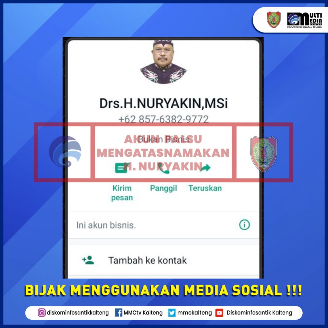 Kali ini nama yang dicatut adalah nama Pejabat Sekda Provinsi Kalteng Drs H Nuryakin, M.Si. Beredar sebuah akun Whatsapp palsu menggunakan foto Profil dan Nama Pj. Sekretaris Daerah Prov. Kalteng Drs. H. Nuryakin, M.Si.