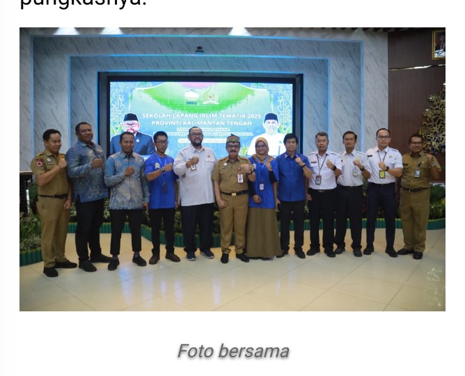 Pemerintah Provinsi Kalimantan Tengah (Pemprov Kalteng) bekerja sama dengan Badan Meteorologi, Klimatologi, dan Geofisika (BMKG) menyelenggarakan Kegiatan Sekolah Lapang Iklim (SLI) Tematik Tahun 2025, bertempat di Aula Badan Perencanaan Pembangunan, Riset, dan Inovasi Daerah (Bapperida) Provinsi Kalimantan Tengah, Senin (27/10/2025).