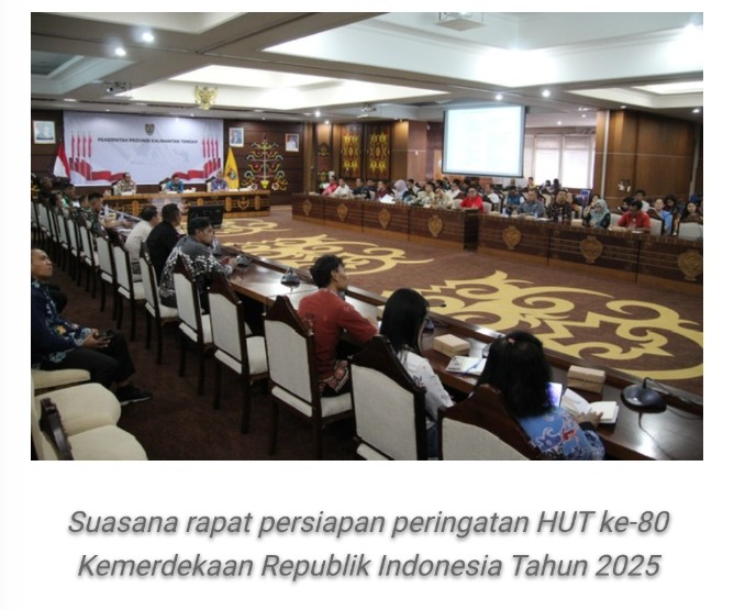 Pemerintah Provinsi Kalimantan Tengah menggelar rapat ketiga persiapan peringatan Hari Ulang Tahun (HUT) ke-80 Kemerdekaan Republik Indonesia Tahun 2025, bertempat di Aula Eka Hapakat, Kantor Gubernur Kalteng, Jumat (8/8/2025).