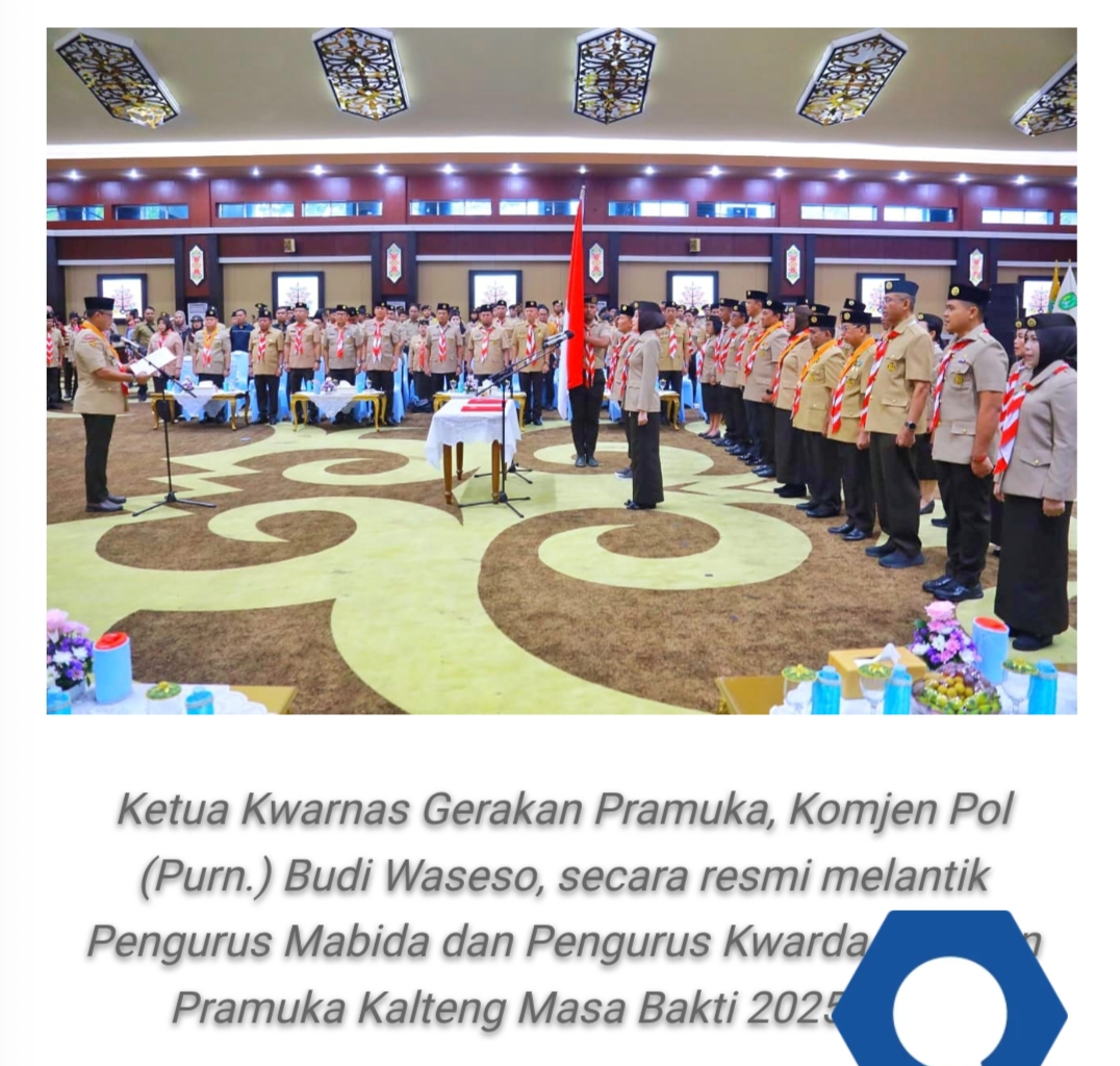 Pengurus Majelis Pembimbing Daerah (Mabida) dan Pengurus Kwartir Daerah (Kwarda) Gerakan Pramuka Kalteng Masa Bakti 2025-2030 resmi dilantik oleh Ketua Kwartir Nasional (Kwarnas) Gerakan Pramuka, Komjen Pol (Purn.) Budi Waseso, bertempat di Aula Jayang Tingang, Kantor Gubernur Kalteng, Kamis (21/8/2025).