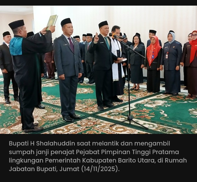 Bupati Barito Utara H. Shalahuddin menegaskan komitmennya untuk mempercepat konsolidasi birokrasi di tahun pertama masa kepemimpinannya. Upaya tersebut ditandai dengan pelantikan empat pejabat pimpinan tinggi pratama yang digelar di Rumah Jabatan Bupati pada Jumat (14/11/2025).