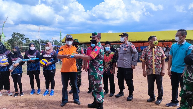 Diakhir acara Dandim 1017/Lmd menyerahkan seperangkat sarana olahraga berupa bola Voli, Net, papan skor, peluit, dan bendera hakim.