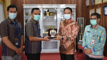 (FOTO : Bupati Lamandau H Hendra Lesmana (dua dari kanan) menyerahkan cindera mata kepada Manager UPP KLB 2 Benaya S Winowoda, Kamis (14/10/2021))*by.