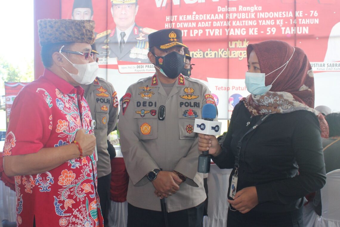 PALANGKA RAYA, JurnalBorneo.co.id – Guna mewujudkan zona hijau Covid-19 di Provinsi Kalimantan Tengah, Polda Kalteng berkolaborasi bersama Dewan Adat Dayak (DAD) Kalteng, kembali menggelar vaksinasi massaldi Huma Betang, Jalan R.T.A Milono KM. 04, Kota Palangka Raya, Kamis (23/09/2021) pagi.