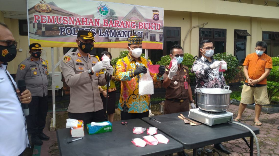 Satuan Reserse Narkoba Polres Lamandau, Kalimantan Tengah memusnahkan barang bukti narkotika golongan 1 jenis sabu-sabu seberat 1774, 95 gram pada hari Kamis 4 Februari 2021 di Halaman Mapolres Lamandau Kalimantan Tengah.