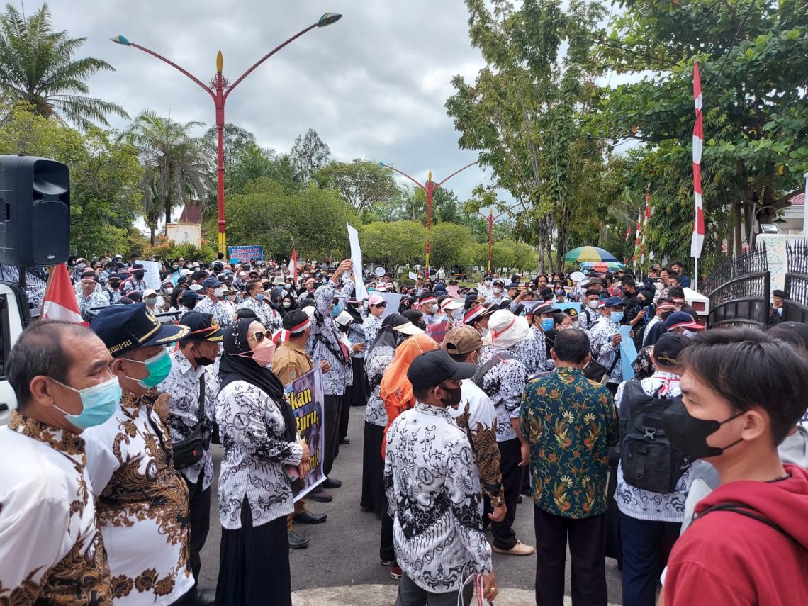 Dalam aksinya, ratusan guru menuntut Pengembalian Tunjungan Kerja Daerah yang dihapus oleh Pemerintah Provinsi Kalimantan Tengah.
