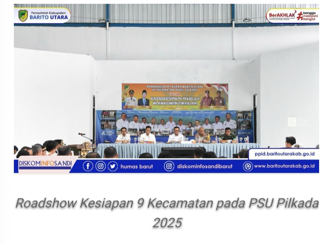 Penjabat (Pj) Bupati Barito Utara, Indra Gunawan, beserta jajaran, melanjutkan rangkaian kunjungan kerja hari ketiga dalam rangka Roadshow Kesiapan 9 Kecamatan pada PSU Pilkada 2025, dengan meninjau langsung kesiapan pelaksanaan Pemungutan Suara Ulang (PSU) Pemilihan Kepala Daerah (Pilkada) Kabupaten Barito Utara Tahun 2025 di Kecamatan Teweh Selatan dan Teweh Baru, Rabu (16/7/2025).