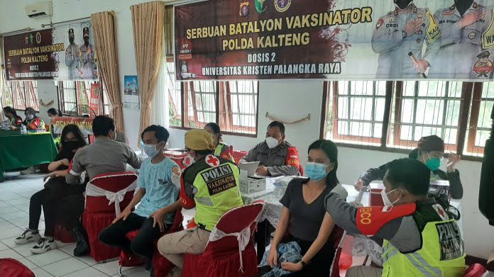 PALANGKA RAYA, JurnalBorneo.co.id – Guna wujudkan Provinsi Kalimatan Tengah zona hijau, Vaksinator Rumah Sakit Bhayangkara Tk III Palangka Raya, Polda Kalteng terus menggelar vaksinasi yang bertajuk Serbuan Batalyon Vaksinator Polda Kalteng bertempat di Universitas Kristen Palangka Raya (Unkrip) Jalan J.P. Jandan No. 1, R.T.A. Milono Km. 8,5 Kota Palangka Raya, Senin (25/10/2021) pagi.