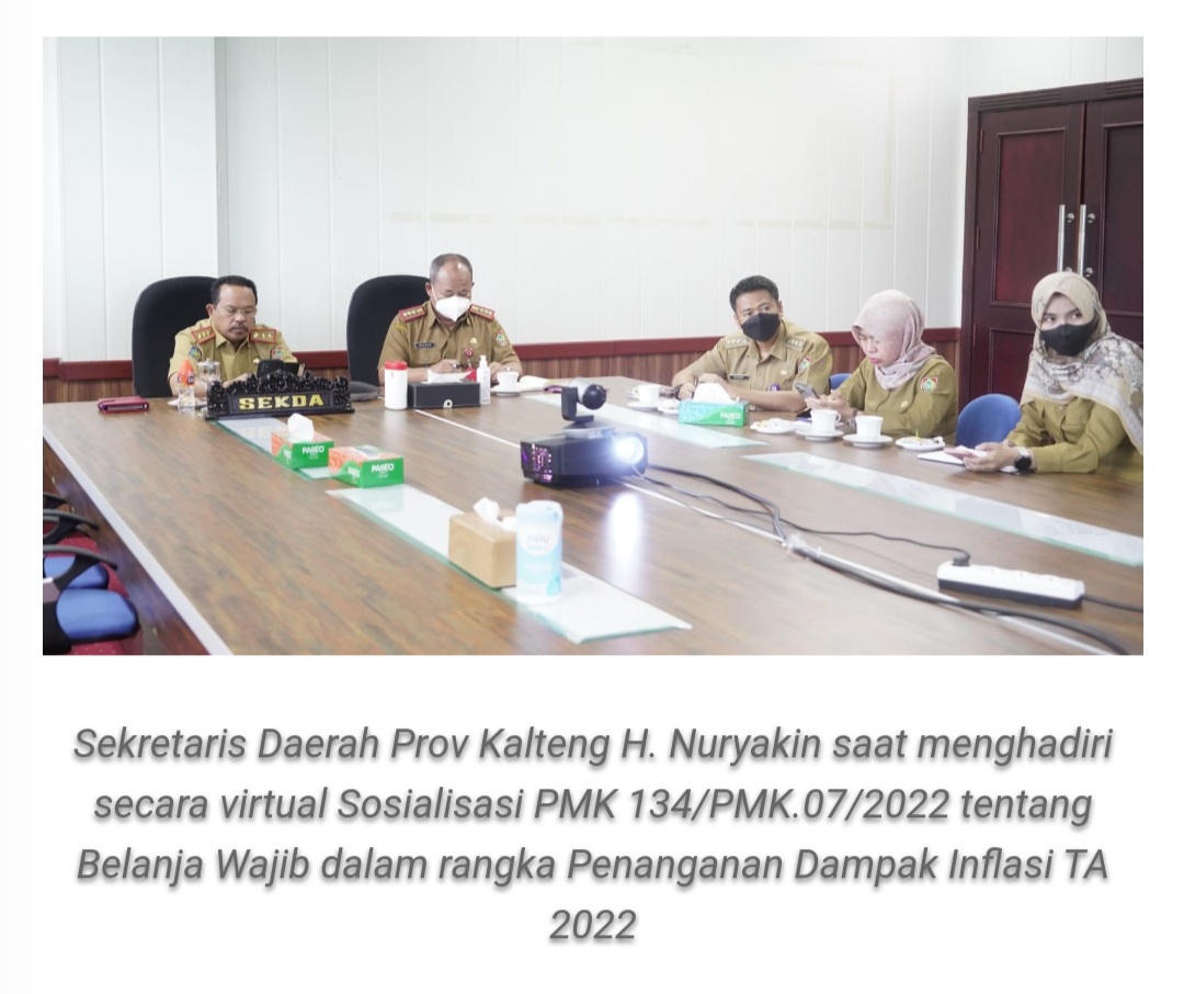 PALANGKA RAYA, Jurnalborneo.co id — Sekretaris Daerah Provinsi Kalimantan Tengah (Prov Kalteng), H. Nuryakin, menghadiri Sosialisasi Peraturan Menteri Keuangan (PMK) Nomor 134/PMK.07/2022 tentang Belanja Wajib Dalam Rangka Penanganan Dampak Inflasi Tahun Anggaran 2022.