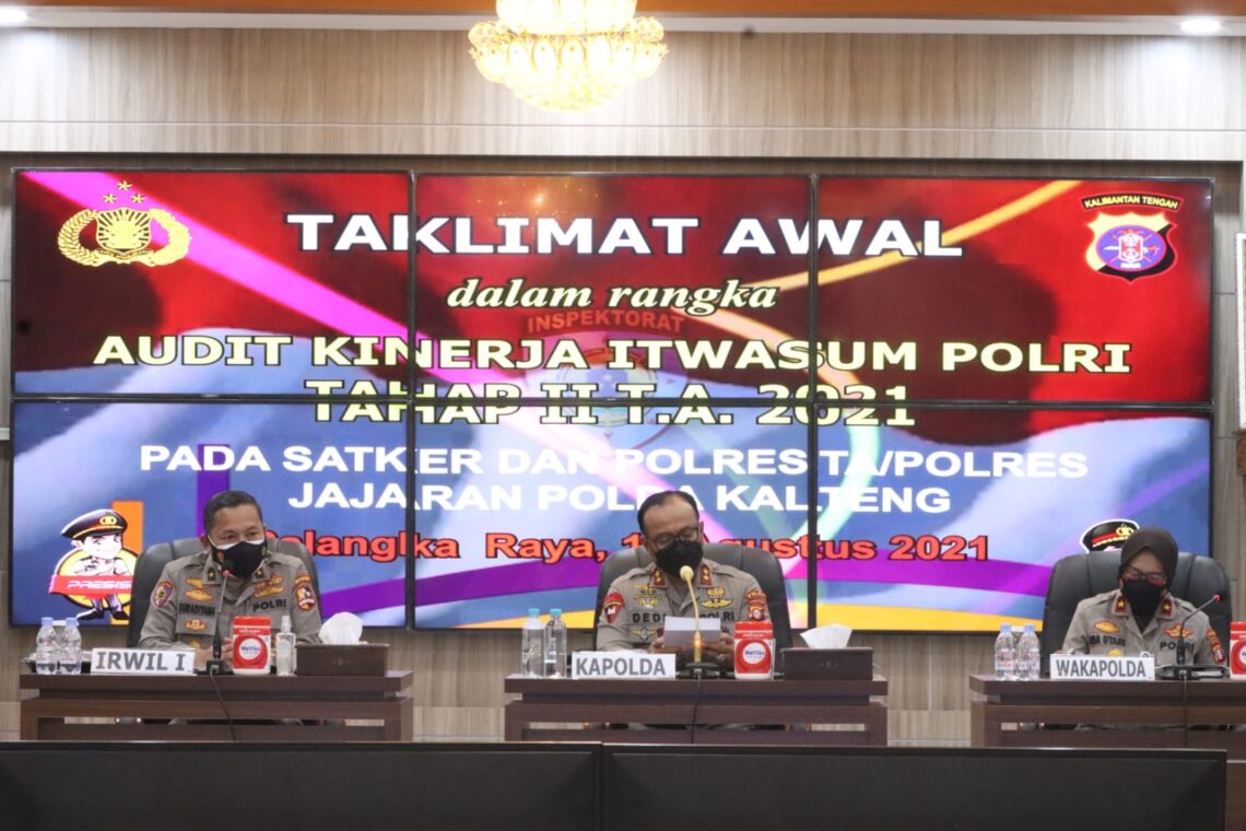 PALANGKA RAYA, JurnalBorneo.co.id – Kepala Kepolisian Daerah Kalimantan Tengah Irjen Pol Dr. Dedi Prasetyo, M.Hum., M.Si., M.M., membuka taklimat awal audit kinerja Itwasum (Inspektorat Pengawasan Umum) Polri tahap II tahun anggaran 2021 bertempat di Aula Arya Dharma, Mapolda setempat, Rabu (18/8/21) pagi.