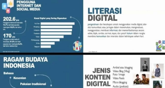 “Banyak hal maupun kegiatan bermanfaat yang bisa dilakukan masyarakat Indonesia melalui literasi digital, salah satunya mengenalkan budaya yang dimiliki,” kata narasumber Webinar Indonesia Makin Cakap Digital Jihan Novitasari wilayah Gunung Mas, Kamis.