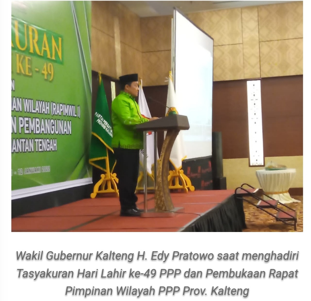 Saat membacakan sambutan tertulis Gubernur Kalteng H. Sugianto Sabran, Edy mengatakan dalam menjalankan program unggulan, pemerintah tidak dapat berjalan sendiri, perlu dukungan dari berbagai partai politik termasuk PPP sebagai mitra pembangunan daerah dengan saling bahu-membahu bersama Pemerintah Daerah, bekerja demi sebuah tujuan bersama, menciptakan kesejahteraan bagi seluruh masyarakat Kalteng.