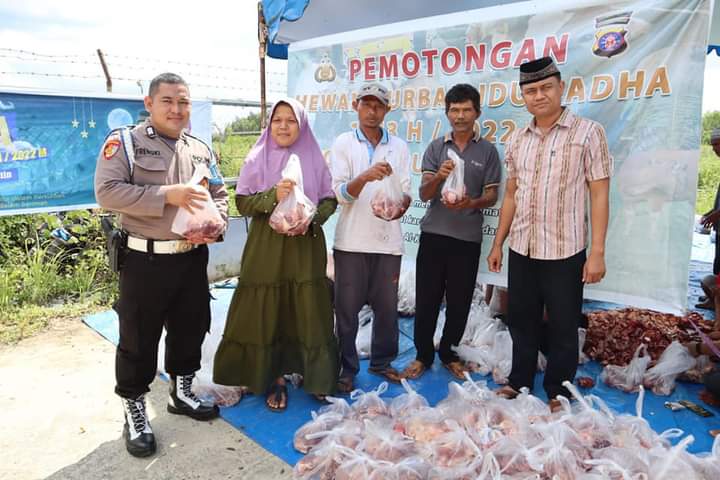 Pulang Pisau, JurnalBorneo.co.id – Pasca dilakukan penyembelihan Hewan Qurban, Kapolres Pulang Pisau, AKBP Kurniawan Hartono, S.I.K., melalui Wakapolres Pulang Pisau Kompol Nandi Indra Nugraha, S. IP, S.I.K., menyerahkan secara simbolis daging Qurban kepada perwakilan masyarakat dan Personel Polres, Minggu (10/07/2022).