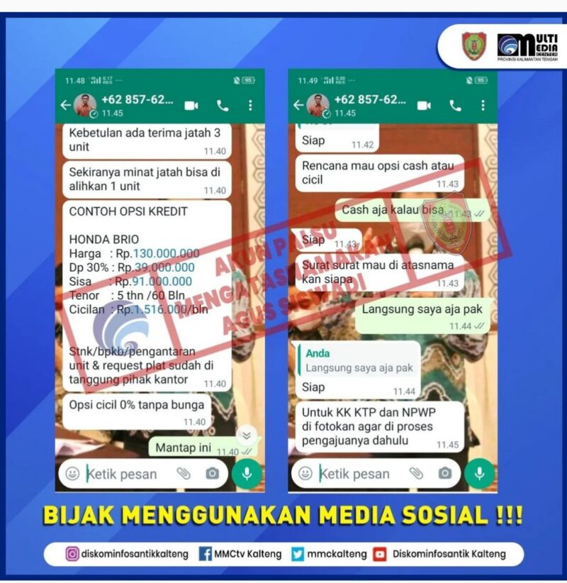 PALANGKA RAYA, JurnalBorneo.co.id — Masyarakat harus waspada atas beredarnya sebuah akun Whatsapp palsu dengan nomor +62 857-6208-9388 menggunakan foto profil dan nama Kepala Dinas Komunikasi Informatika Persandian dan Statistik Prov Kalteng Agus Siswadi.