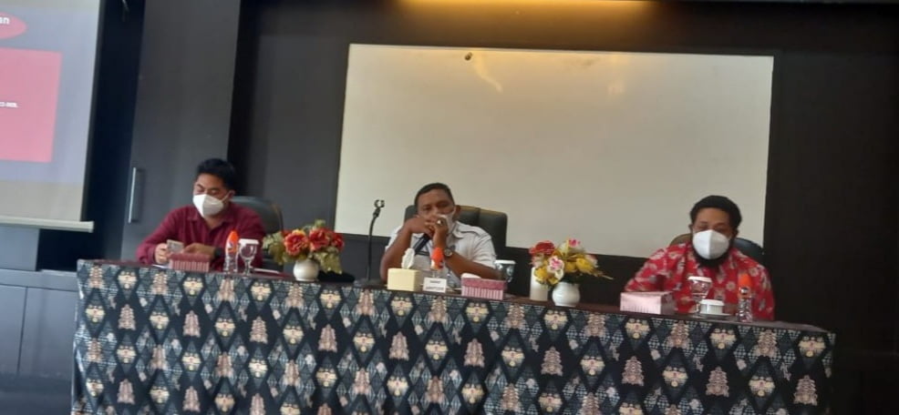 (FOTO : Sub Koordinator P2M BNNK Palangka Raya C. Allan Sitompul (tengah) didampingi Ketua PWI Kalteng M. Haris Sadikin (batik merah) dan Wakil Ketua KPI Kalteng Chris Philip Alessandro di acara Workshop Penguatan Kapasitas kepada Insan Media, Kamis (30/9/2021))*fer.